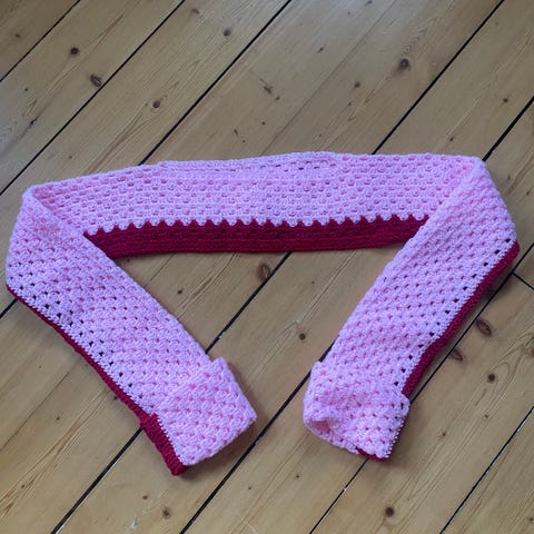 Længde 200 cm bredde ca 15 cm Ærmebredde ca 28 cm. Pink og lilla