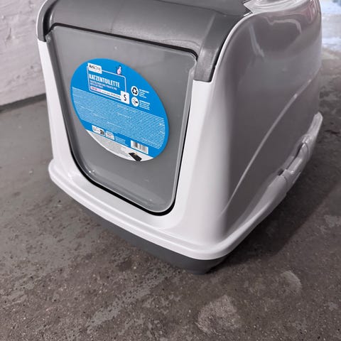 Kattetoilet med indgang i plast. Kattetoilettet består af en lukket boks med håndtag og aftageligt låg samt en separat bakke. Farvekombination i hvid og mørkegrå.