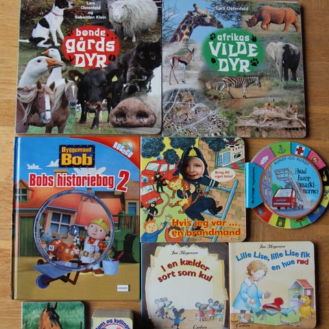 Børnebog med titlen "og dyrene". Papbog med tykke sider og farverige illustrationer af bondegårdsdyr, blandt andet ko, får, hund, kat og høne. Velegnet til mindre børn, der skal lære om dyr og bondegårdsmiljø gennem billeder og enkel tekst.