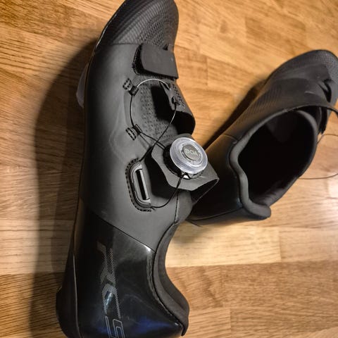 Shimano RC1 cykelsko i størrelse 37. Modellen er en landevejscykelsko med tre velcrolukninger. Skoene er sorte med perforeret overdel for ventilation. De har stiv sål egnet til klamper til landevejspedaler. Velegnet til cykling på landevej eller indendørs cykeltræning, hvor der bruges kliksko.