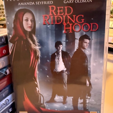 Red Riding Hood dvd. Fantasythriller baseret på eventyret om Rødhætte. Udgave med dansk og finsk tekstbeskrivelse på omslaget samt oplysninger om medvirkende og tekniske specifikationer på bagsiden. Egnet til afspilning i standard dvd-afspillere.