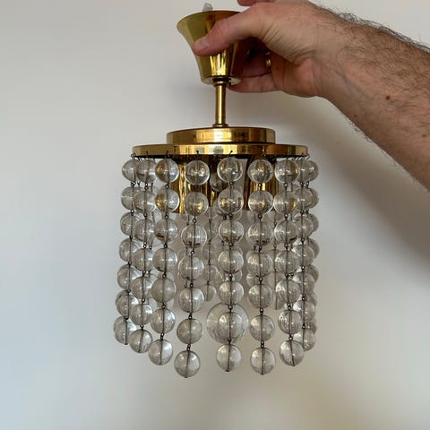 Vintage messing loftslampe med presset glaskuppel – 40/50’er messingpendel