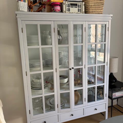 vitrine med glas hylder