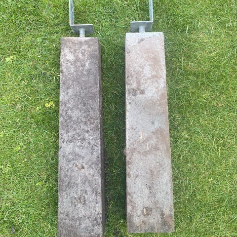 stolpebærere med firkantede beslag og armeringsjern som spyd. Stolpebærerne er velegnede til fastgørelse af træstolper i fx hegn, carport eller andre mindre konstruktioner, hvor stolper skal forankres i jorden. Mål fremgår af billederne med tommestok for længde og bredde på beslagene.