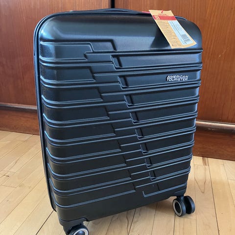 Rulletaske, kabinekuffert. fremstillet i sort læder med orange for.