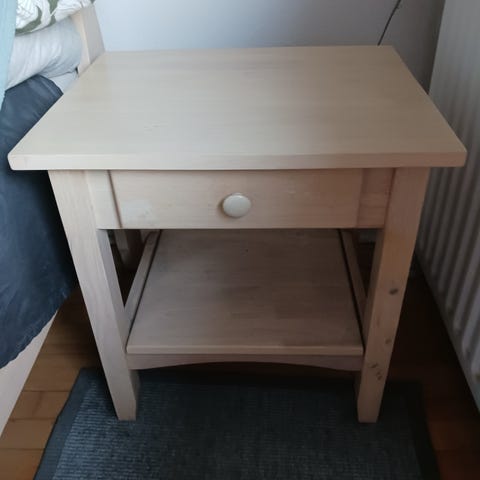 To flotte sengeborde i træ med skuffe. Fine som nye. Har små hjul og kan derfor nemt rykkes rundt. Sælges samlet.