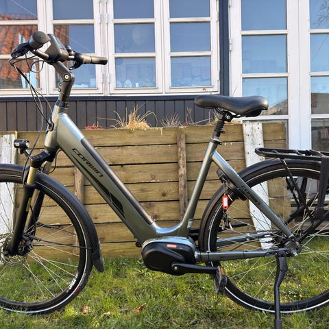 Cyklen er godt brugt (28000 km) men stadig meget brugbar. Modellen hedder Macina Tour 10P5, stel størrelse 60 cm, 10 udvendige gear. Hydrauliske skivebremser fra Shimano.