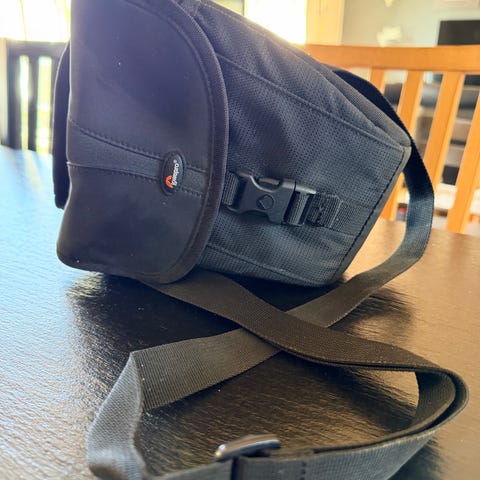 LOWEPRO kamerataske der aldrig er brugt. Indvendigt er den 16 cm bred og 10 cm dyb og 10 cm høj og der er en flytbar skillevæg samt en lomme i låget.