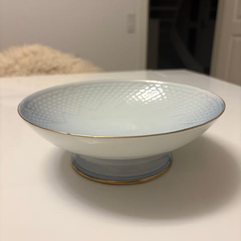 Bing & Grøndahl mågeserie porcelætfad i blå og hvid. Fadet har bølget kant, håndtag i den ene ende og guldkant langs kanten. Dekoreret med mågemotiv i midten og reliefmønster langs kanten. Diameteren er ca. 18–20 cm målt på billederne. Velegnet som serveringsfad eller dekorationsfad. Stemplet i bunden med Bing & Grøndahl Copenhagen Porcelain, Made in Denmark og formnummer 356.
