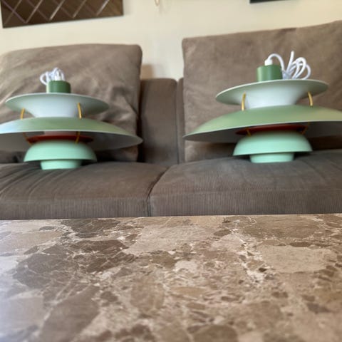 Louis Poulsen PH5 pendel designet af Poul Henningsen. Loftlampen er udført i lakeret metal med blå yderside og lys inderside, samt rød detalje omkring fatningen. Klassisk flerskærmskonstruktion, der giver blændfrit og nedadrettet lys. Velegnet som belysning over spisebord, sofabord eller i køkken og opholdsrum.