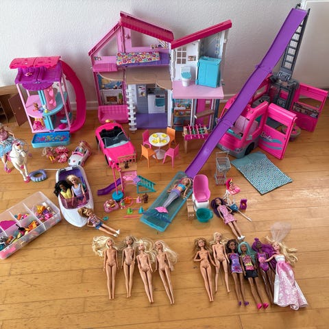 Barbie dukker og tilbehør. Sættet omfatter flere Barbie dukker samt forskelligt tilbehør, herunder en større pink campingvogn, bord og små møbler, samt dyr som heste og enhjørning. Der indgår også dukker klædt som havfruer og en dukke i mere hverdagsagtigt tøj. Sættet er egnet til leg med rollelege, fantasileg og samling af Barbie figurer og tilbehør.