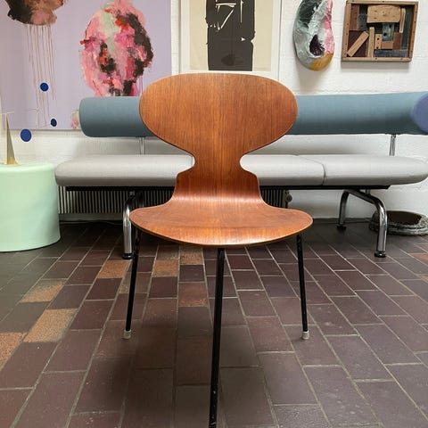 En stol er med løst sæde, som blot skal sættes fast. Alle stole har det originale stolebetræk i uld på som da de i sin tid blev købt. Uldbetræk.