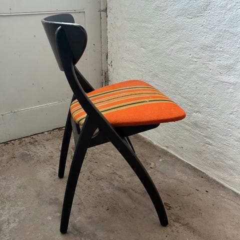Savbukkestol, malet sorte, er oprindelig teak teaktræ eller maghoni mahognitræ.