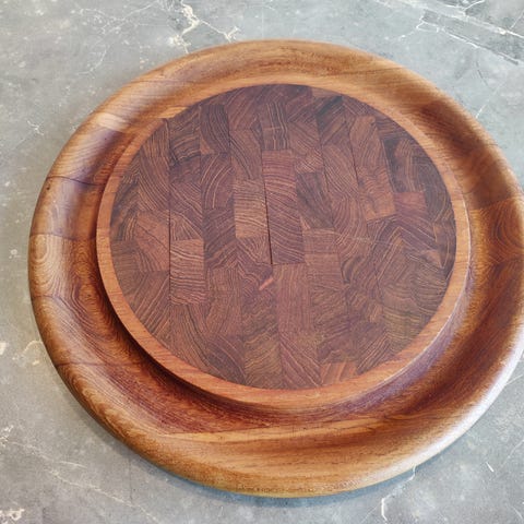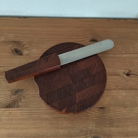 Klassisk rundt ostebræt i teaktræ med en integreret kniv, designet af Jens Harald Quistgaard for Dansk Designs.