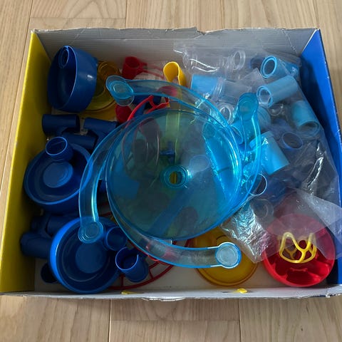 legetøj plastikdele i blandede farver. Sættet består af forskellige plastdele i flere former og størrelser, herunder rør, ringe og små komponenter i klare og stærke farver som gul, rød, blå, grøn, lilla og orange. Delene er velegnede som tilbehør til børns leg, fx til at bygge eller konstruere simple strukturer. Materialet er hård plast, og delene leveres samlet i en plastkasse, som gør det nemt at opbevare og holde styr på legetøjet.