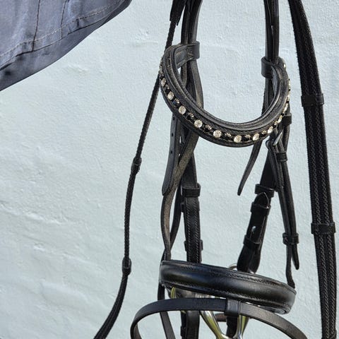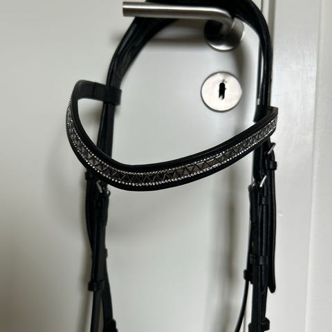 Shetlænder Trense i sort læder med næsebånd og pandebånd. Pandebåndet er udsmykket med flere rækker små flerfarvede sten.