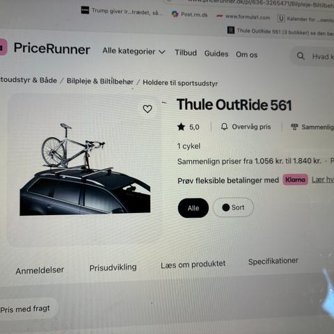 Thule tagbøjler og 2 cykelholdere til montering på tagbøjlen med 2 nøgler. Modellen er i sort metal med justerbare arme og hjulholdere til fastgørelse af cykler på bilens tag. Velegnet til transport af cykler, hvor cyklen spændes fast ved stel og hjul. Prisen er for hele udstyret.
