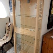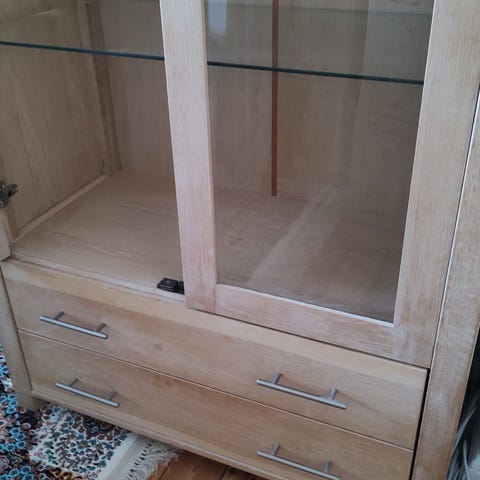 Fint gammelt vitrineskab med 3 hylder med grøn filt på, samt 2 skuffer nedenunder.