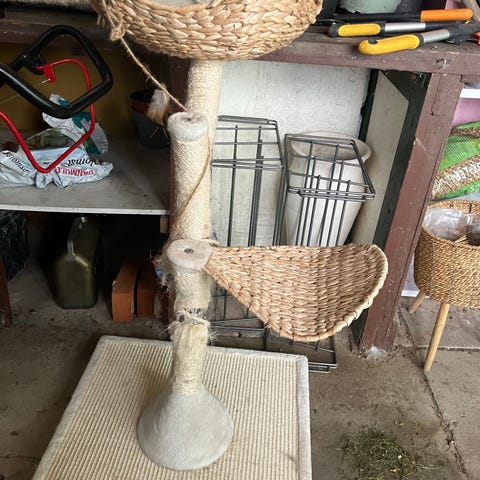 På stammen er der monteret 2 plateauer samt en kurv øverst. De flade hylder er beklædt med kradseegnet materiale, og dele af stammen er omviklet med materiale egnet til krads. Jeg satte ny beklædning på fladerne sidste år, og de fremstår derfor som på bill. 1-4.