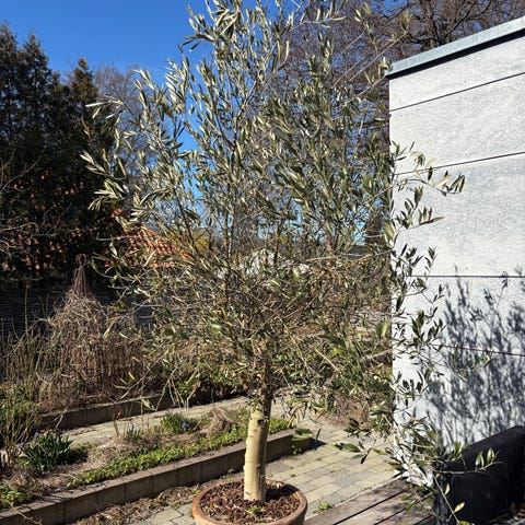 Virkelig smukt og højt oliventræ. Træet er ca 260cm højt og er stort nok til at overvintre udenfor. Har fået gødning hvert år. Har det super.