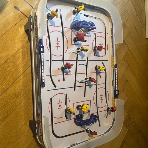 Stiga Play Off bordhockeyspil. Klassisk ishockeyspil med spilleplade, mål og figurer monteret på stænger. Spillerne styres manuelt via håndtag langs kanten af banen. Spillet er egnet til bordbrug og kan bruges af både børn og voksne til to-personers kampe. Alle stumper er med og alle spillere bevæger sig, som de skal. Så fuldt funktionelt, men plastikken er gulnet og bandereklamerne er faldet af. Der er en kosmetisk revne i den ene ende (se billedet).