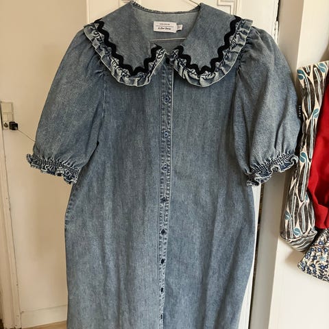 Vero Moda denim hverdagskjole til kvinder i størrelse L. Kjolen er fremstillet i denim og har en lys blå farve. Modellen har pufærmer med manchet og knaplukning samt påsyede lommer foran. Velegnet som hverdagskjole og kan bruges alene eller over eksempelvis leggings eller strømpebukser.