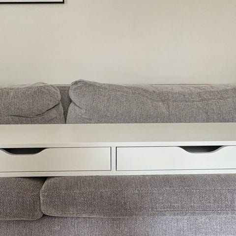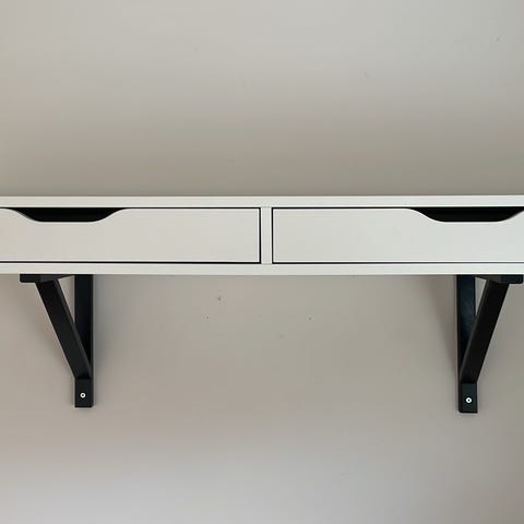 IKEA Ekby Alex væghylde i grå. Reolen er udformet som en rektangulær kasse, der kan monteres på væg. Den er velegnet som lille opbevaringsenhed eller hylde til f.eks. bøger, dekoration eller mindre genstande i stue, soveværelse eller entré. Overfladen er i gråmalet materiale, som giver et neutralt udtryk, der passer ind i mange indretninger.