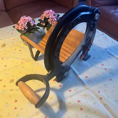 Solid støbejernskonstruktion med træbræt og original klinge.