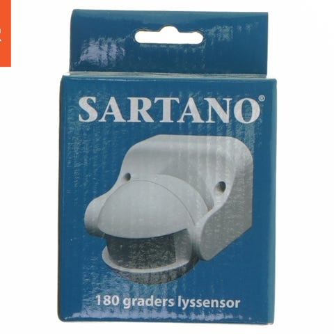 Dette er en Sartano 180 graders justerbar lysensor, ideel til udendørs brug. Den har justerbar lysdetektion op til 12 meter og er IP44 vurderet, hvilket betyder, at den er beskyttet mod vandstænk. Den er designet til at fungere med både glødelamper med en effekt op til 1200W og LED lamper med en effekt op til 300W. Standbyforbruget er 0,9W. Produktets størrelse er 22x9 cm.