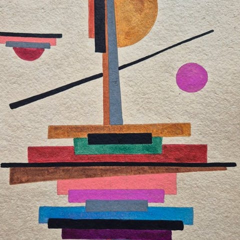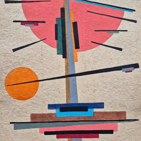 Abstrakt konstruktivistisk og suprematistisk arbejde i gouache på papir med klare geometriske former og en afbalanceret farvekomposition.