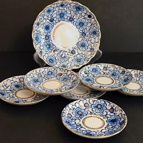 Velkommen! Vi præsenterer seks tallerkener med mønster i guld 22 karat og cobaltblå