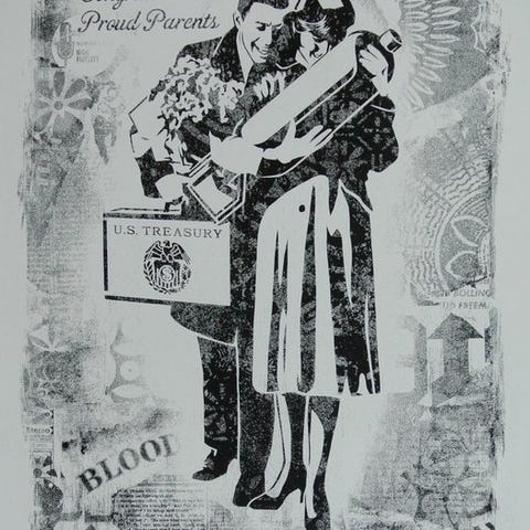 Litografi Obey (Shepard Fairey), litografiske tryk på cremefarvet papir, der præsenterer Shepard Faireys serie til Defend Democracy.