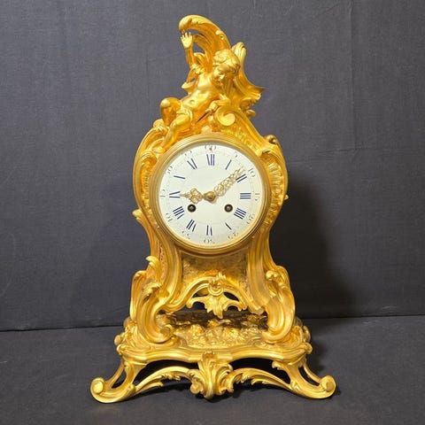 Hej, her er endnu et toptilbud fra tidsforhandleren. En pragtfuld forgyldt fransk pendule med porcelænsur. Urværket er sonisk rengjort og revideret, det løber og slår fremragende.