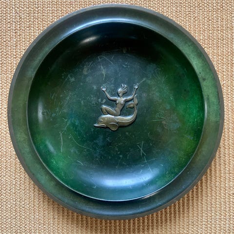 Stort flot patineret skål måler 21 x 7 cm og signeret N. Wolfnagen Denmark Wolfa 8 og vægt på 575 gram til 199,-