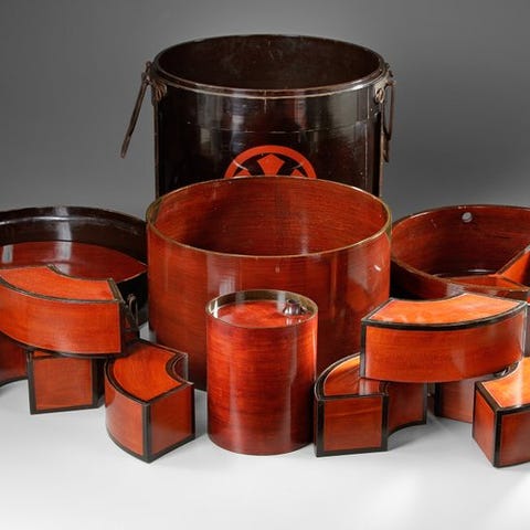 Af stor lodret rektangulær form med tætsiddende etager 印籠蓋 (inrôbuta). Dekorationen forestiller bladgrene med drueklaser, der snoer sig omkring gitterrammer, bladene finhændrede i aogai (blå perlemor). Kompositionen flyder jævnligt fra låget og rundt om alle sider af etagerne.