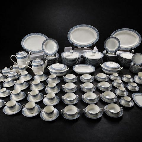 Vigtigt og scenografisk komplet bordservice i dekoreret porcelæn, bestående af 98 stykker, fremstillet i Macao i anden halvdel af det XX. århundrede, i perioden med størst udvikling af produktionen til det internationale marked, identificeret i kataloget Replacements med modelkode HK05.