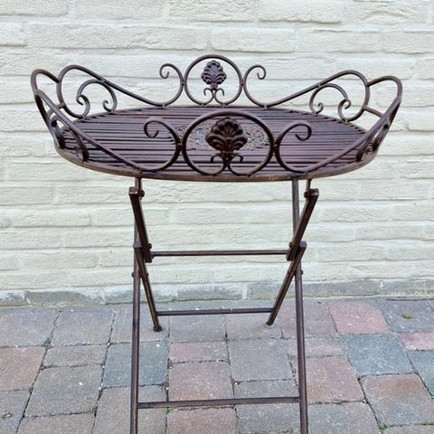 Metalsidebord med rektangulær bordplade ( skal udskiftes ) og dekorativt smedejernsstel. Bordet har buede ben med ornamenterede detaljer og en metalplade som bordplade. Egnet som lille sidebord eller konsolbord i fx stue, entré eller altan. Mål fremgår af billederne med målebånd.