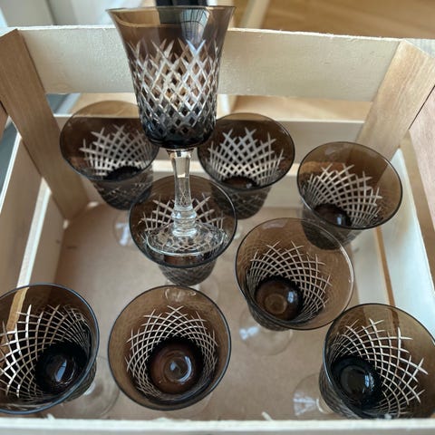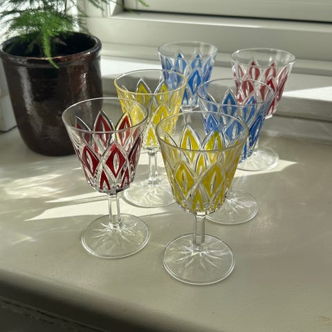 Velholdte glas med få brugsspor i de indfarvede områder på et par af glassene. Har aldrig været i opvaskemaskinen.