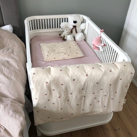 Der medfølger sengeskuffe, madras + madrasforlænger og rullemadras, som passer til tremmesengen.