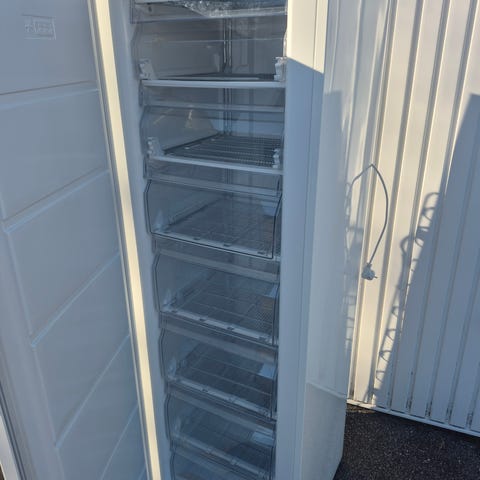 Scandomestic skabsfryser i hvid. Selvafrimende. Fryseren har flere transparente skuffer og hylder, som giver et godt overblik over indholdet. Fronten er glat med lodret håndtag i siden. På tegningen ses omtrentlige mål: højde ca. 144 cm, bredde ca. 54 cm og dybde ca. 59 cm. Velegnet som fritstående skabsfryser til opbevaring af frostvarer i køkken, bryggers eller kælder.