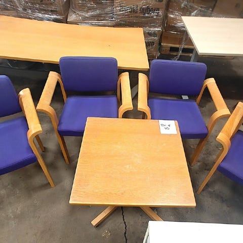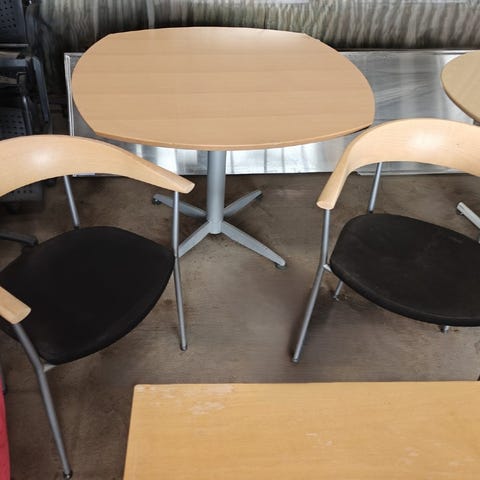 2 Kantineborde og 1 rundt mødebord. Bordplader i massivt træ. Pulverlakerede stå