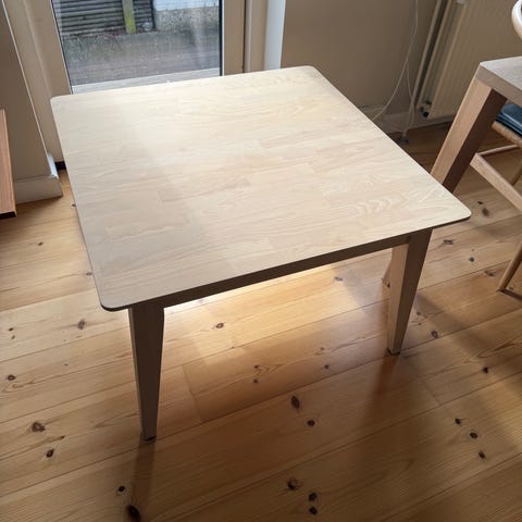 Lakeret bøgetræ med klap på 35cm, og ben der kan afmonteres for let transport/ opbevaring. Størrelse 85 x 130/165 og højde på 55cm