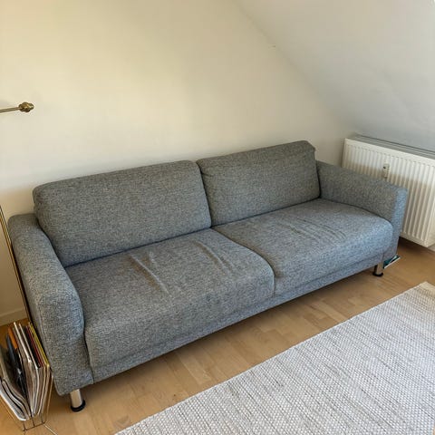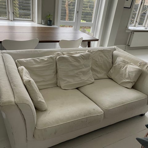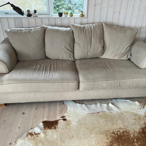Gratis beige 3-personers sofa. Den er lettere slidt og kunne gavne af en rens. Har et hul i betrækket (se billede)