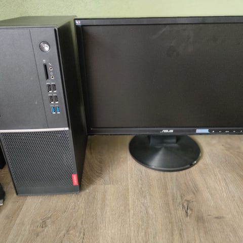 Lenovo stationær computer i kompakt kabinet med USB-porte og lydtilslutninger. Velegnet som arbejds- eller nybegynder gamingcomputer. Trækker fint spil som fortnite, roblox og minecraft.