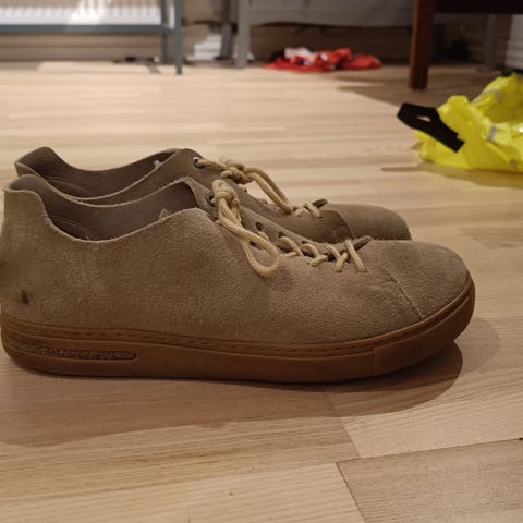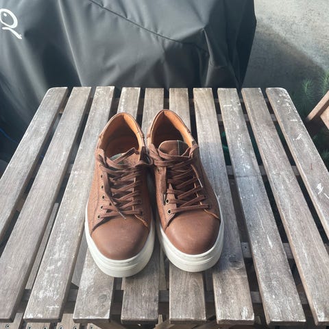 Skoene er brune med mørkeblå snørebånd og lys gummisål. Overdelen i læder med synlige stikninger. Indersålen er formet og polstret for støtte og komfort. Og aldrig brugt.