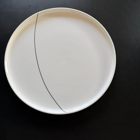 Audo Copenhagen Menu plates in white porcelain. Round plates with simple decoration in the form of a curved, dark line on the surface. Suitable for serving everyday meals or as part of a set table. The design is simple and functional, and the plates can be combined with other tableware in a similar style.