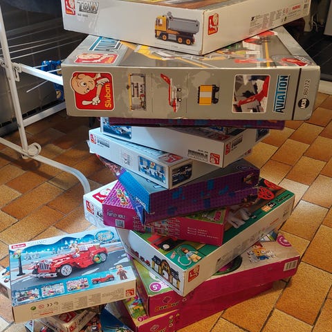 Klodser, Sluban, 7 komplette æsker Sluban plastklodser. Æskerne er ikke åbnet, sælges kun samlet for kr. 200,- og kun afhentning. Passer måske sammen med Lego eller andre plastklodser.