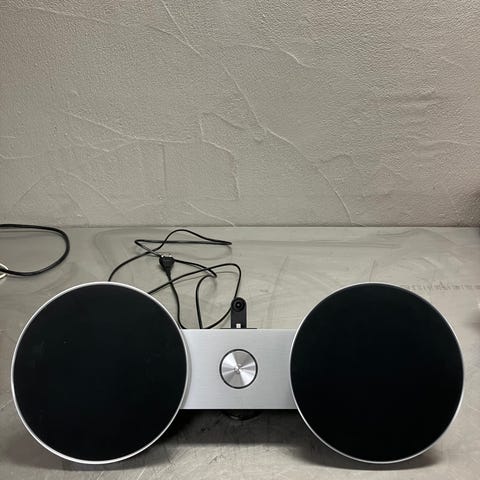 Bang & Olufsen BeoPlay A8 højttaler i hvid. Kompakt alt-i-ét højttalersystem med to runde frontenheder og centralt kontrolhjul. Enheden er beregnet til stationær brug, fx på hylde eller bord, og har tilslutningsmuligheder via kabler på bagsiden. Medfølgende kabler og strømforsyning fremgår af billederne. Velegnet som lydanlæg til stue, kontor eller soveværelse.