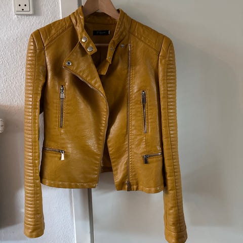 ONLY jakke i fusklæder til kvinder i str. 38. Jakken er gul og har biker-inspireret design med asymmetrisk lynlås foran og lynlåslommer i siderne. Materialet er fusklæder med en blød, ruskinds-lignende overflade. Ærmerne har lynlåse ved håndleddene. Velegnet som overgangsjakke eller let yderjakke. Fotos af de små brugsmærker.