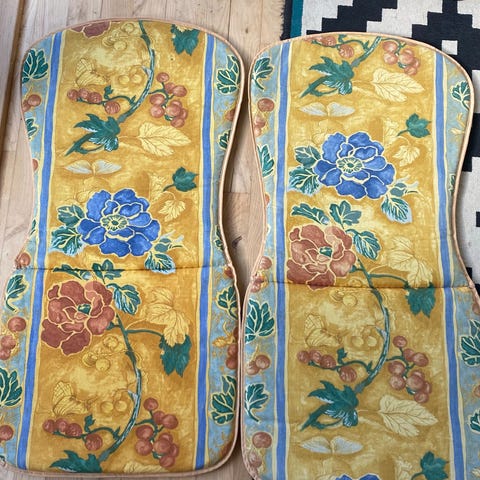 Samlet pris. Mål 72x38(sæde). Havestol hynder i flerfarvet mønstret tekstil. Sættet består af to hynder med ryglæn og sæde i ét stykke, velegnet til brug på havestole eller andre udendørs stole. Designet har felter i blå, grønne, gule og rustfarvede nuancer med blomster- og bladmønstre. Hynderne kan bruges til at øge siddekomforten på terrasse, altan eller i haven.